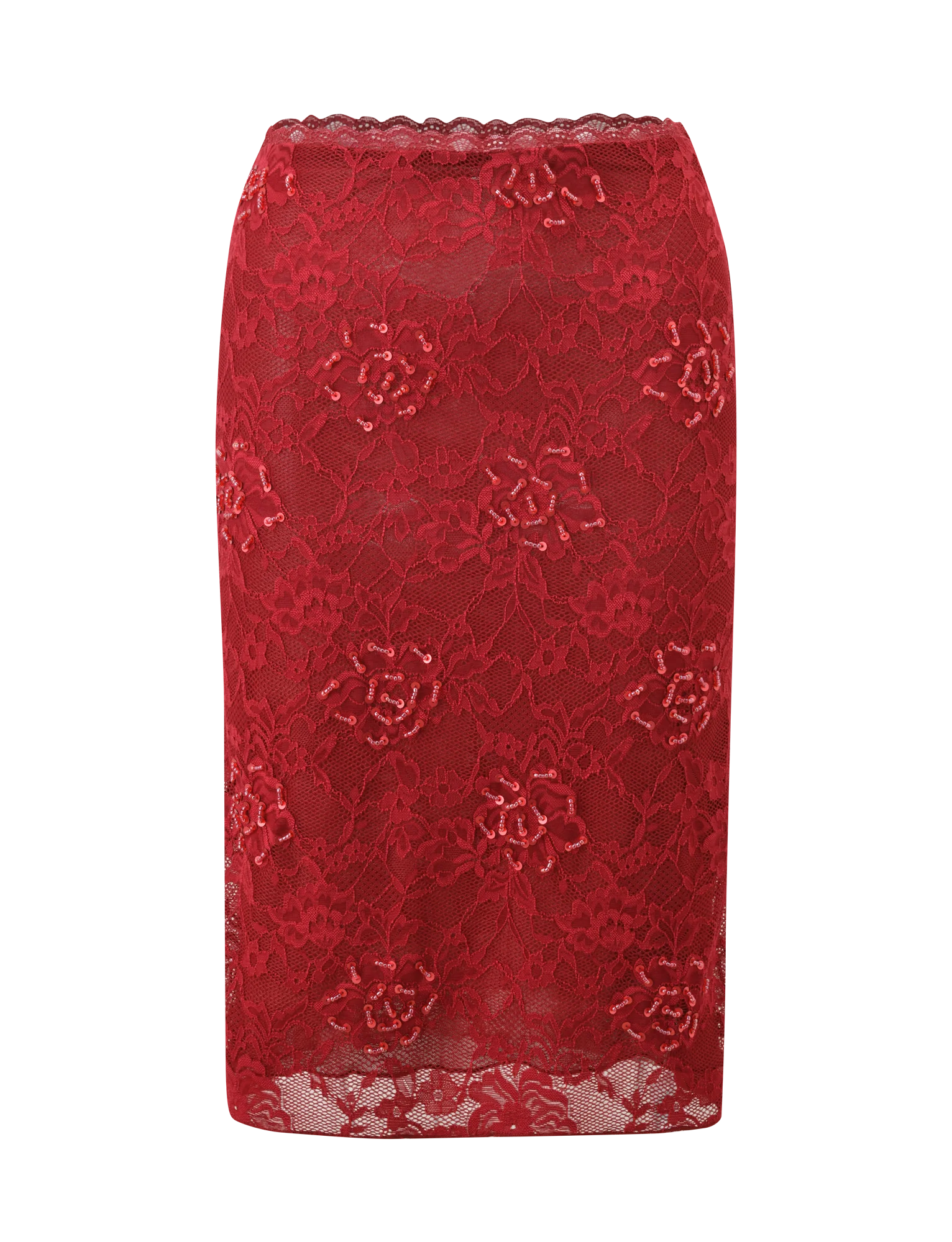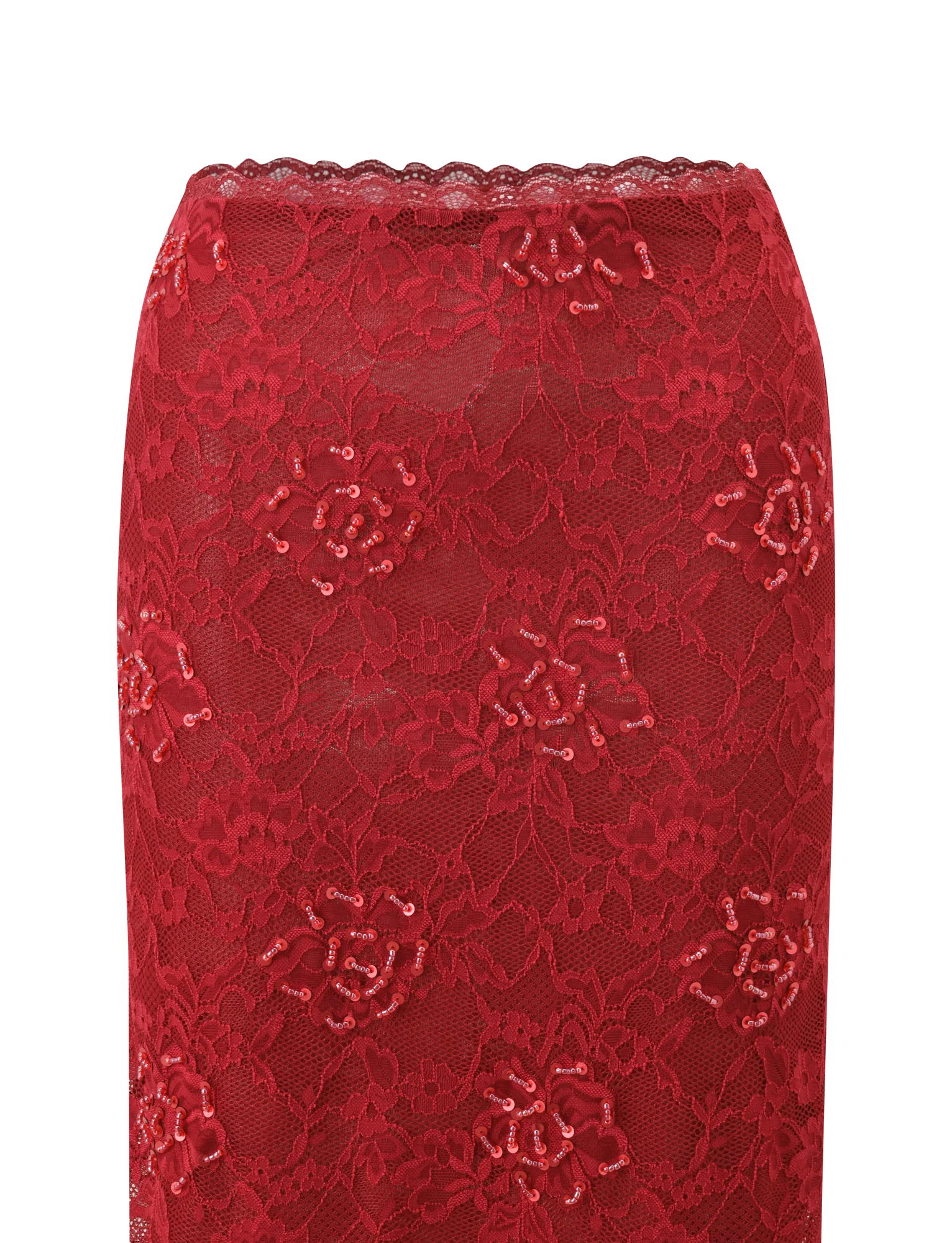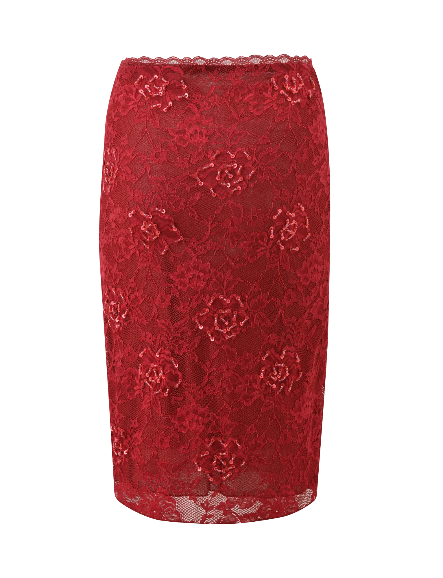 KIRRA BEADED SEQUIN LACE MIDI SKIRT - RED