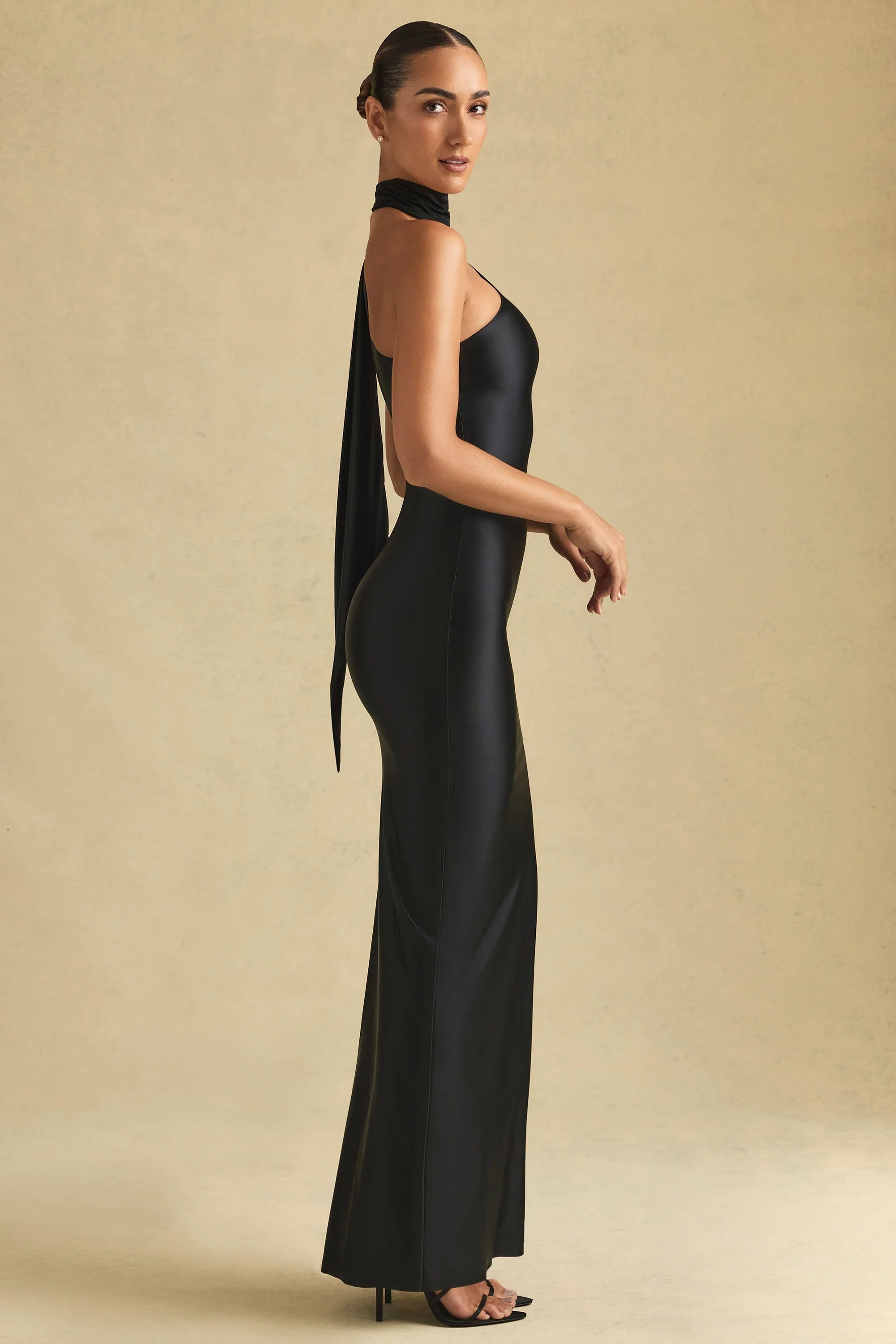 Asymmetric Scarf-Detail Maxi Dress in Black