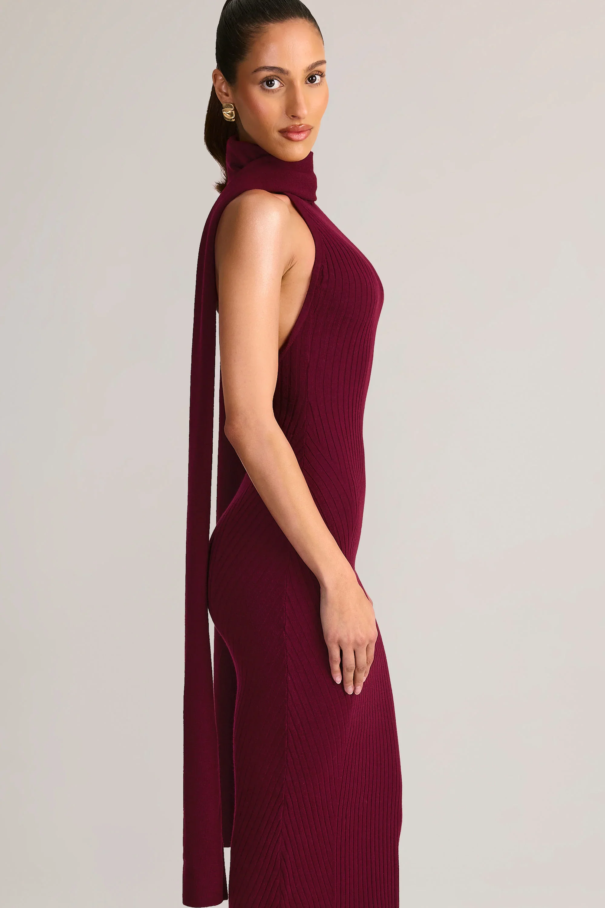 Knit Scarf-Detail Halterneck Maxi Dress in Wine
