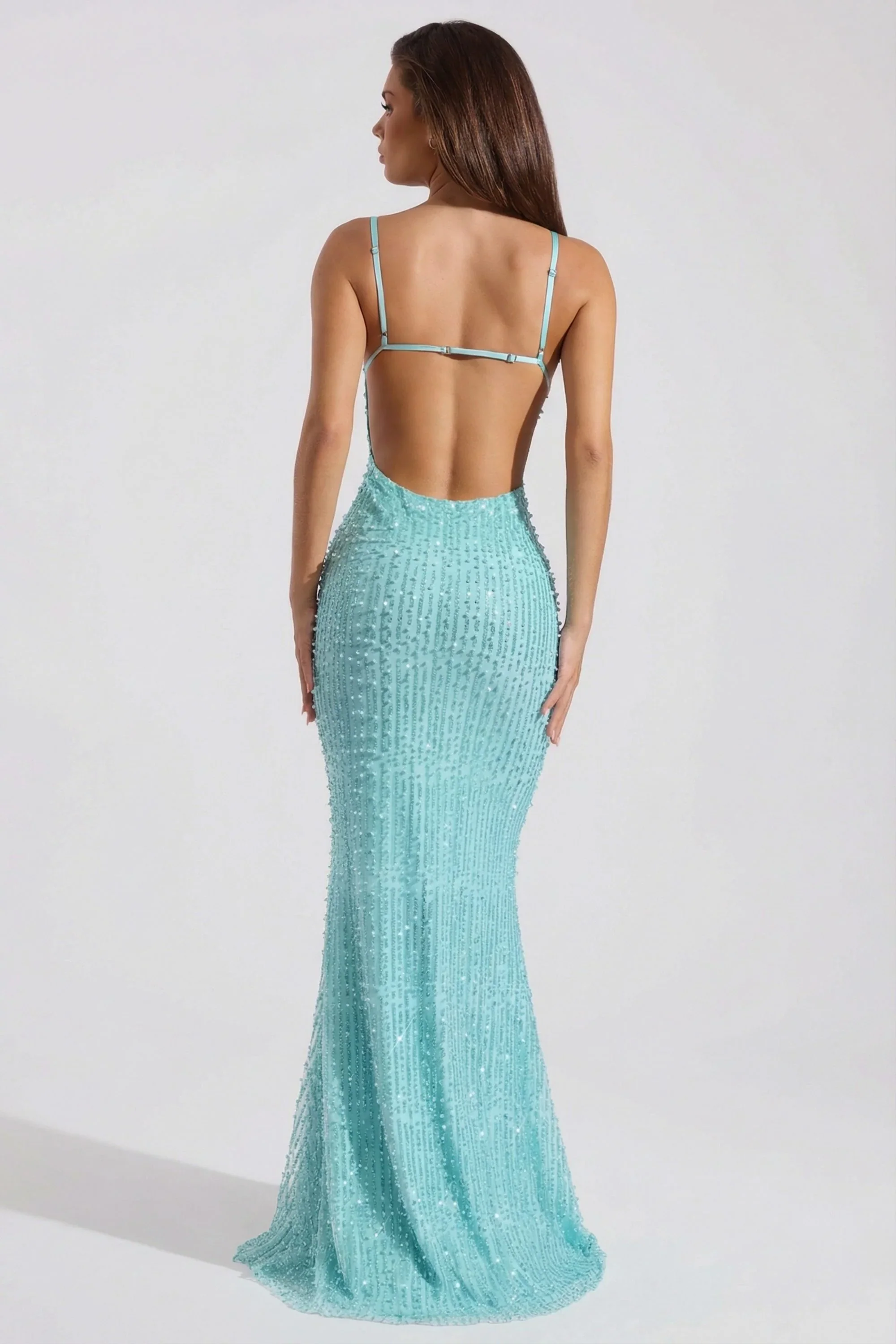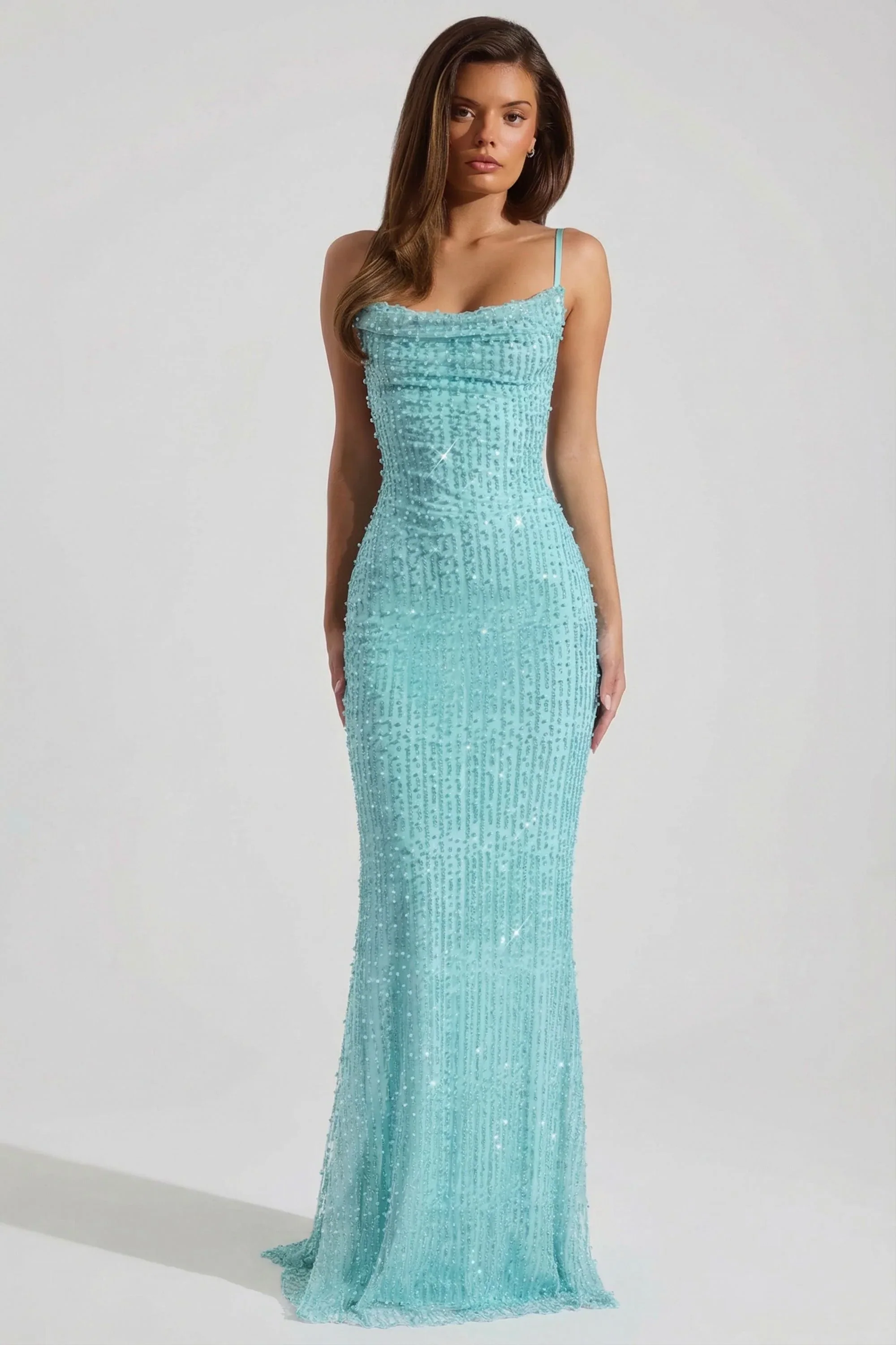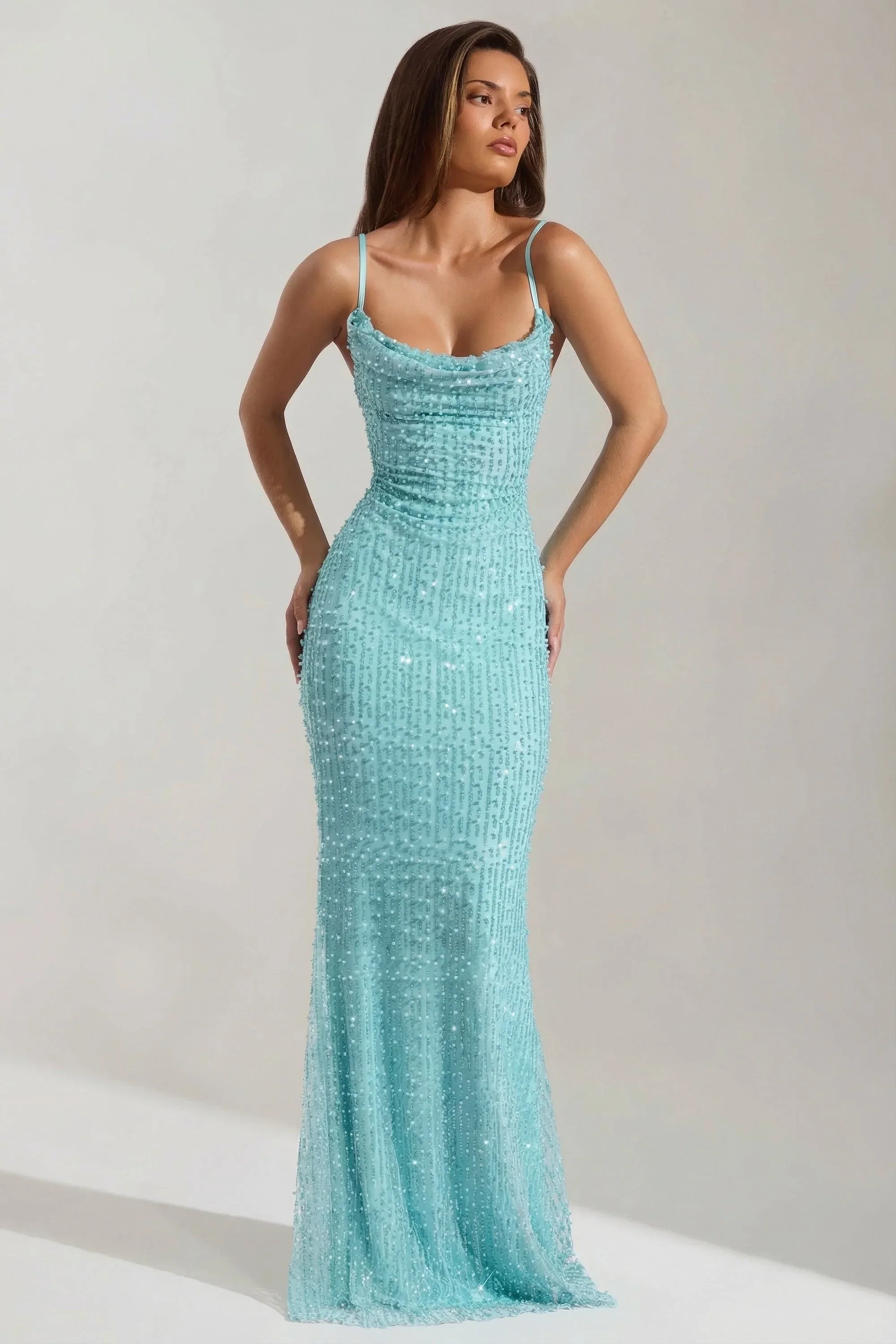Embellished Cowl-Neck Backless Maxi Dress in Aqua Blue