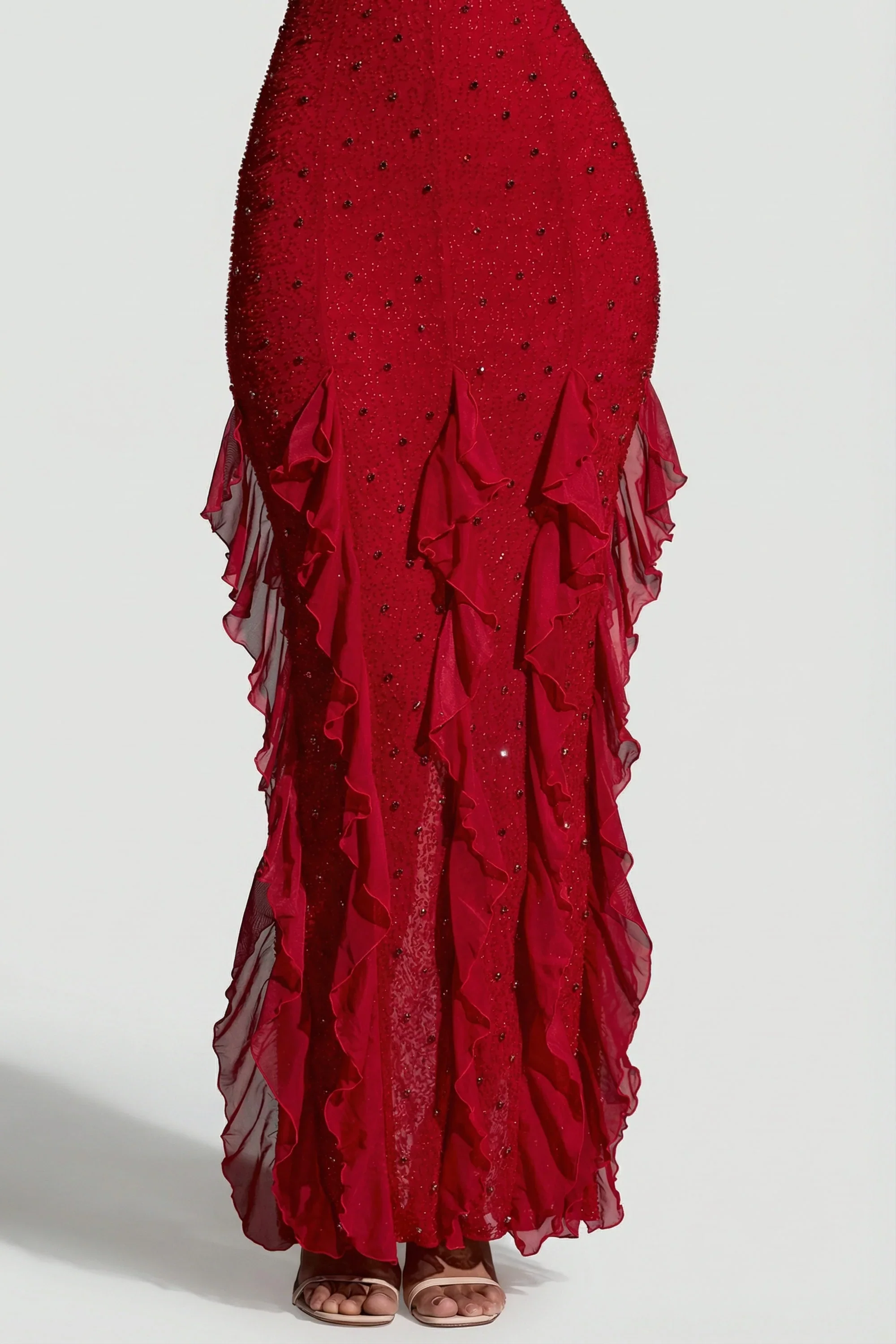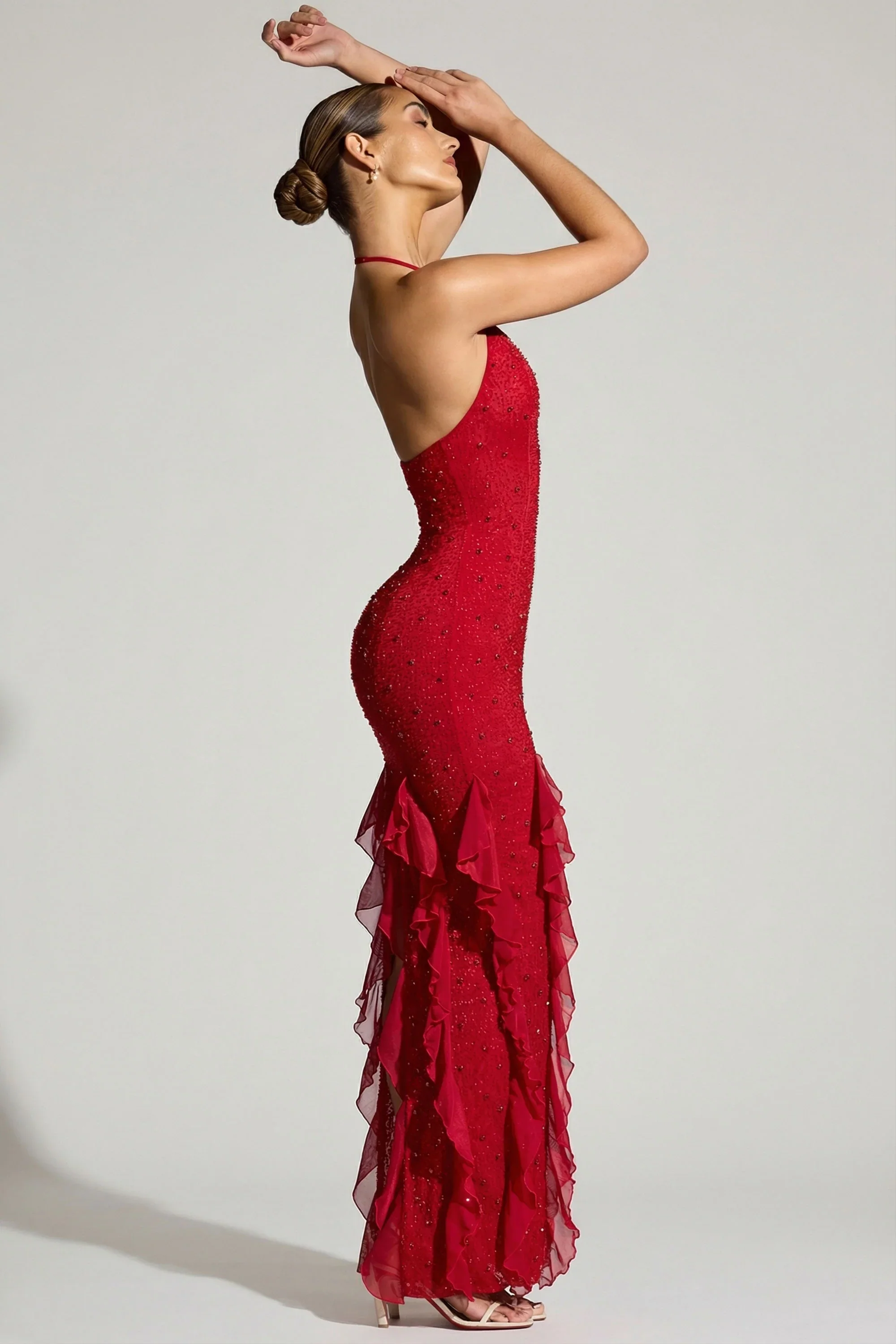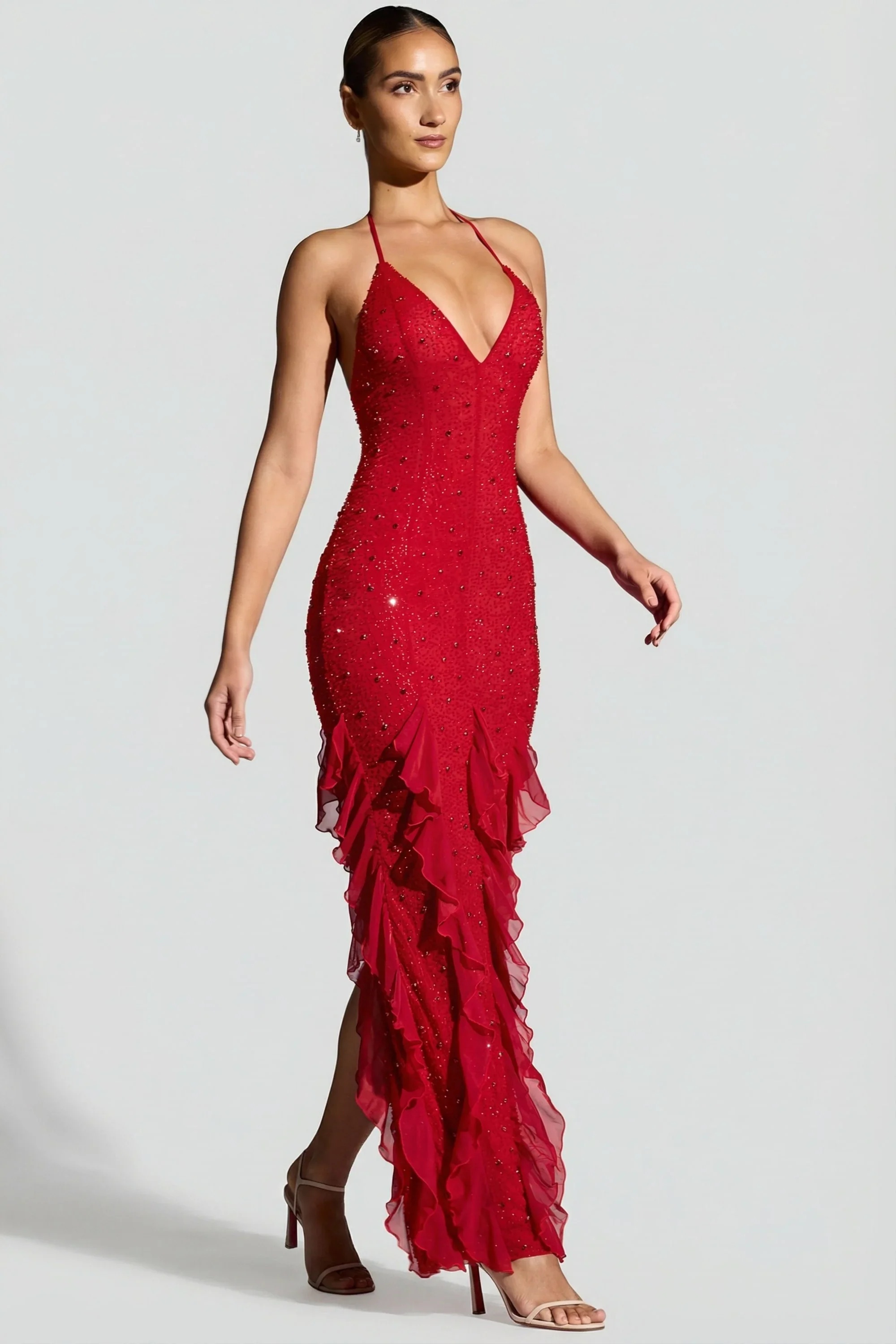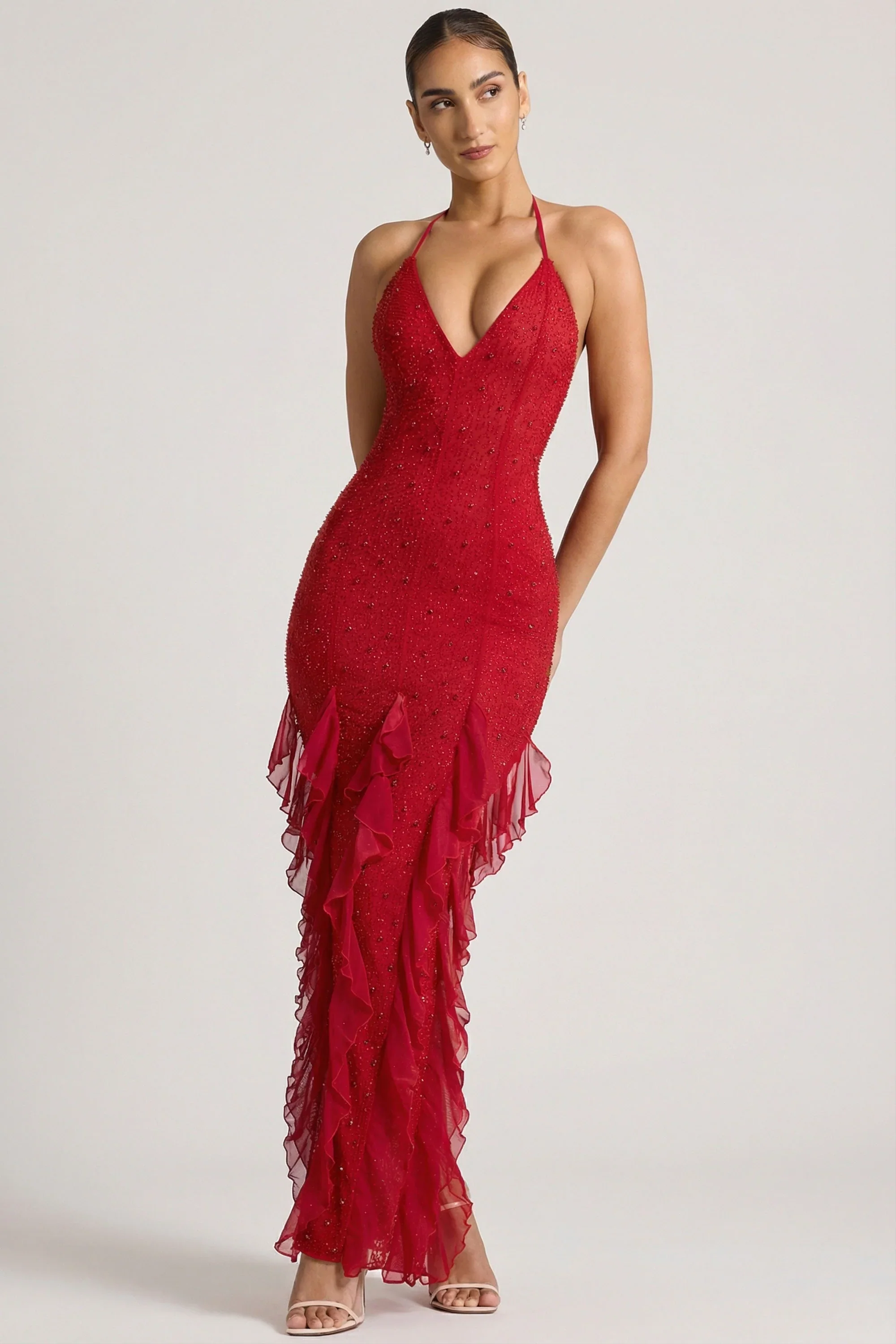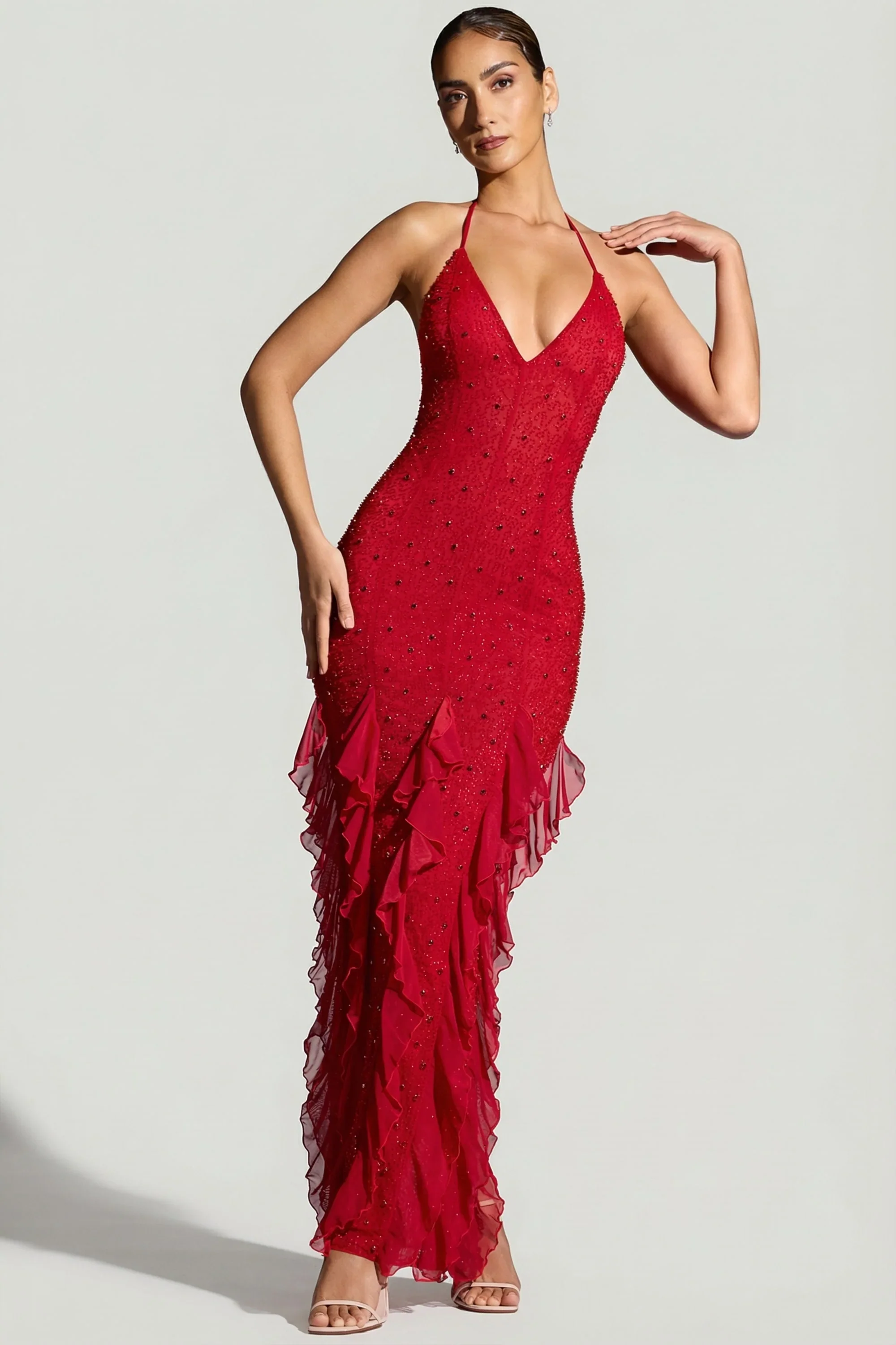 Embellished Halter Neck Ruffle Maxi Dress in Red