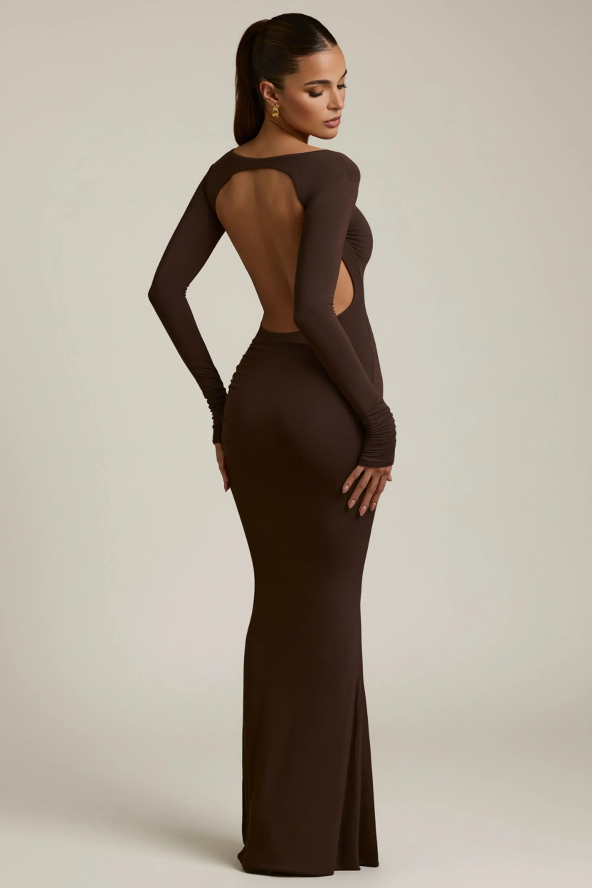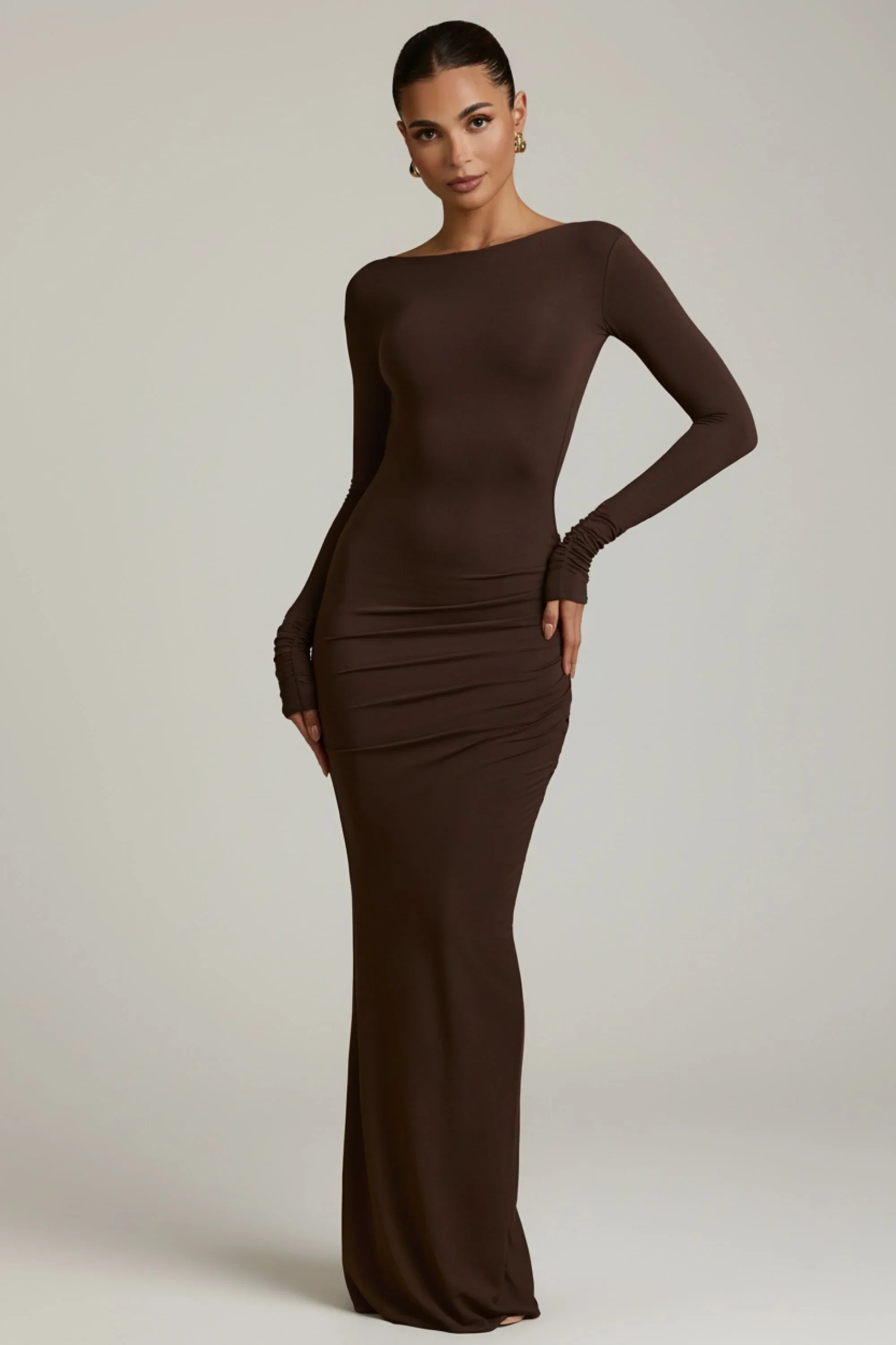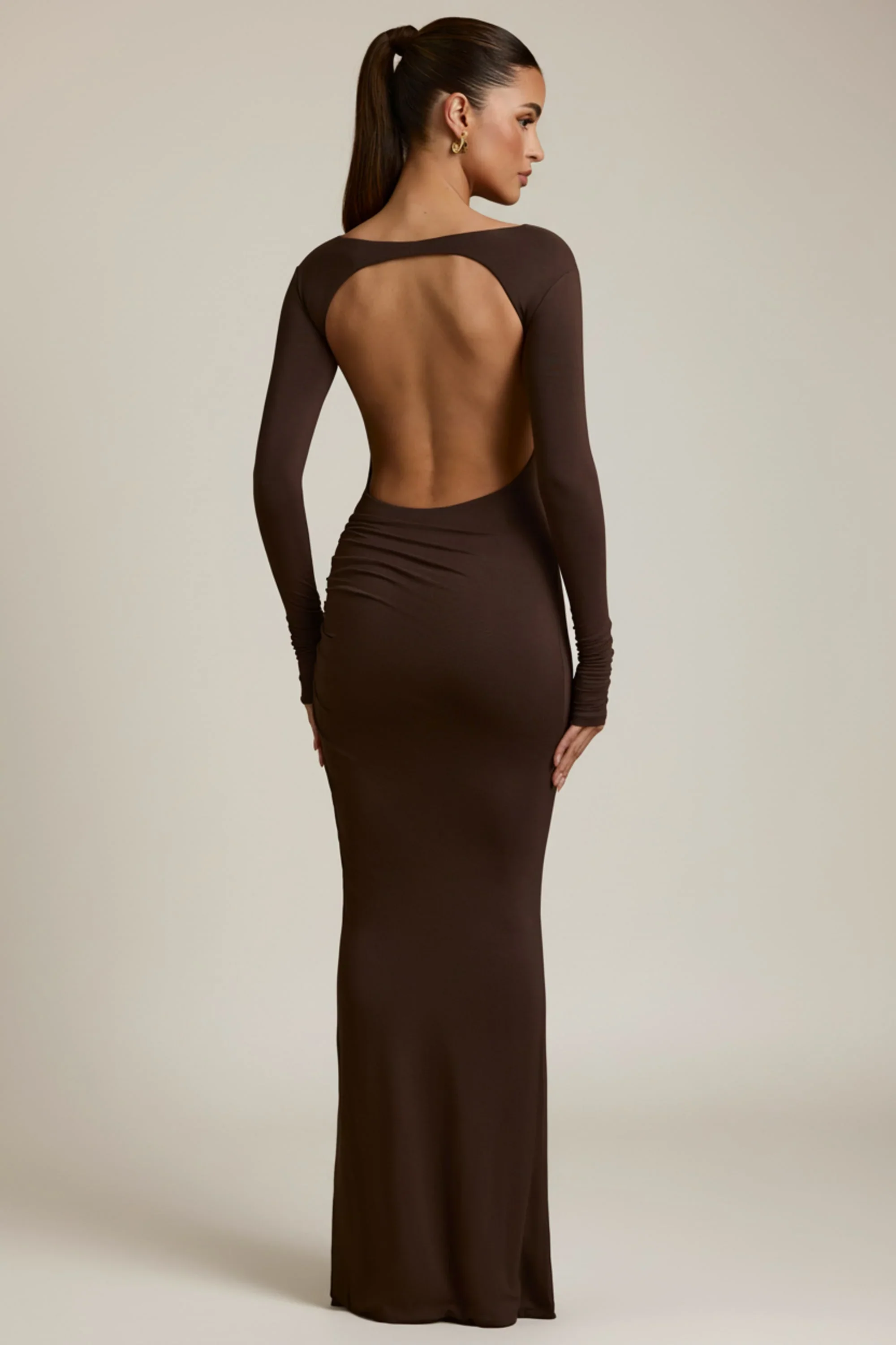 Modal Ruched Backless Maxi Dress in Chocolate Brown