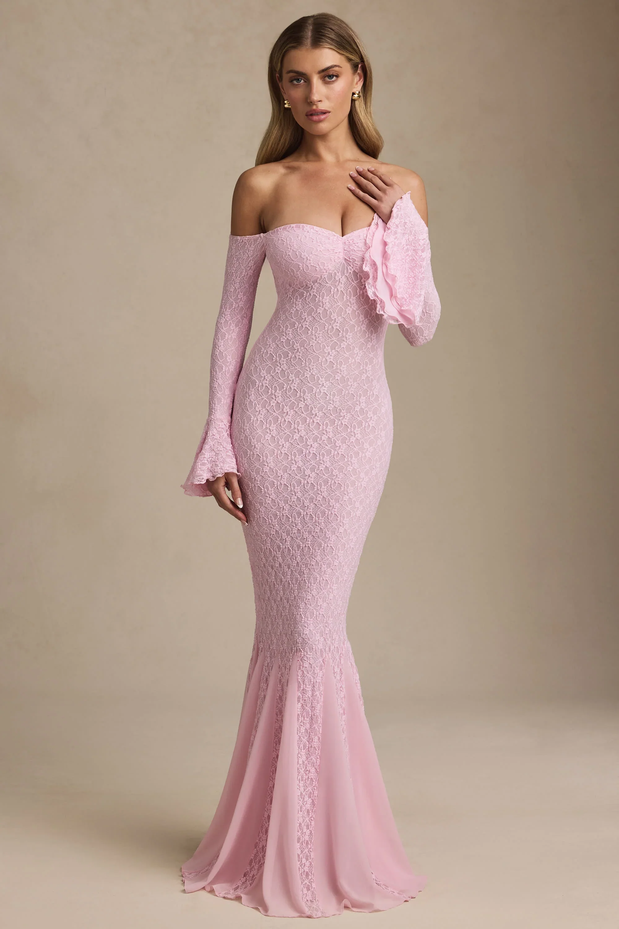Off-Shoulder Ruffle Lace Maxi Dress in Soft Pink