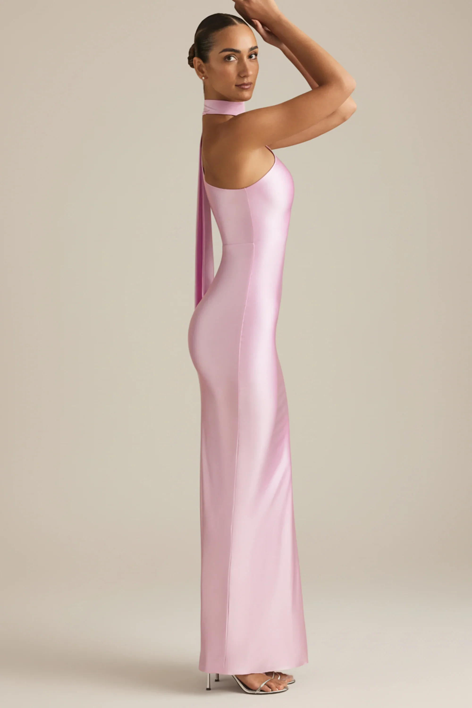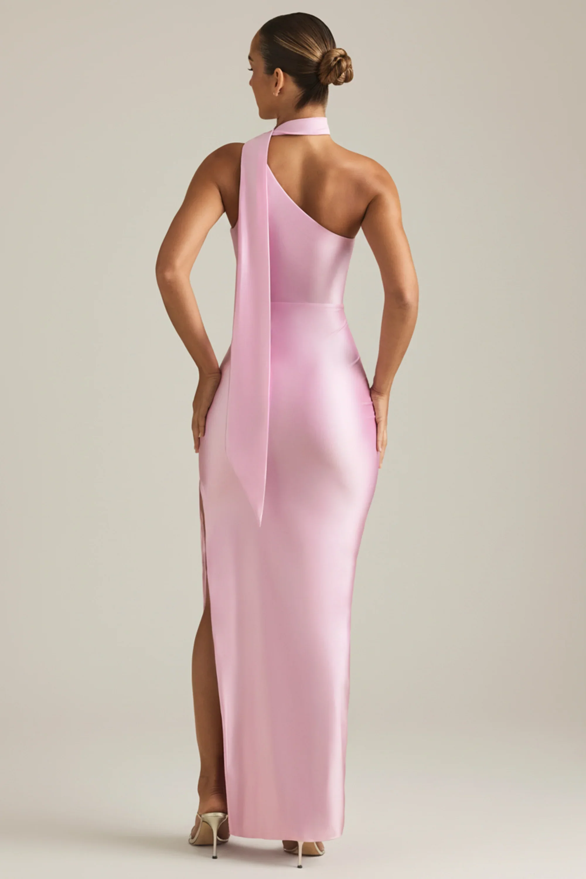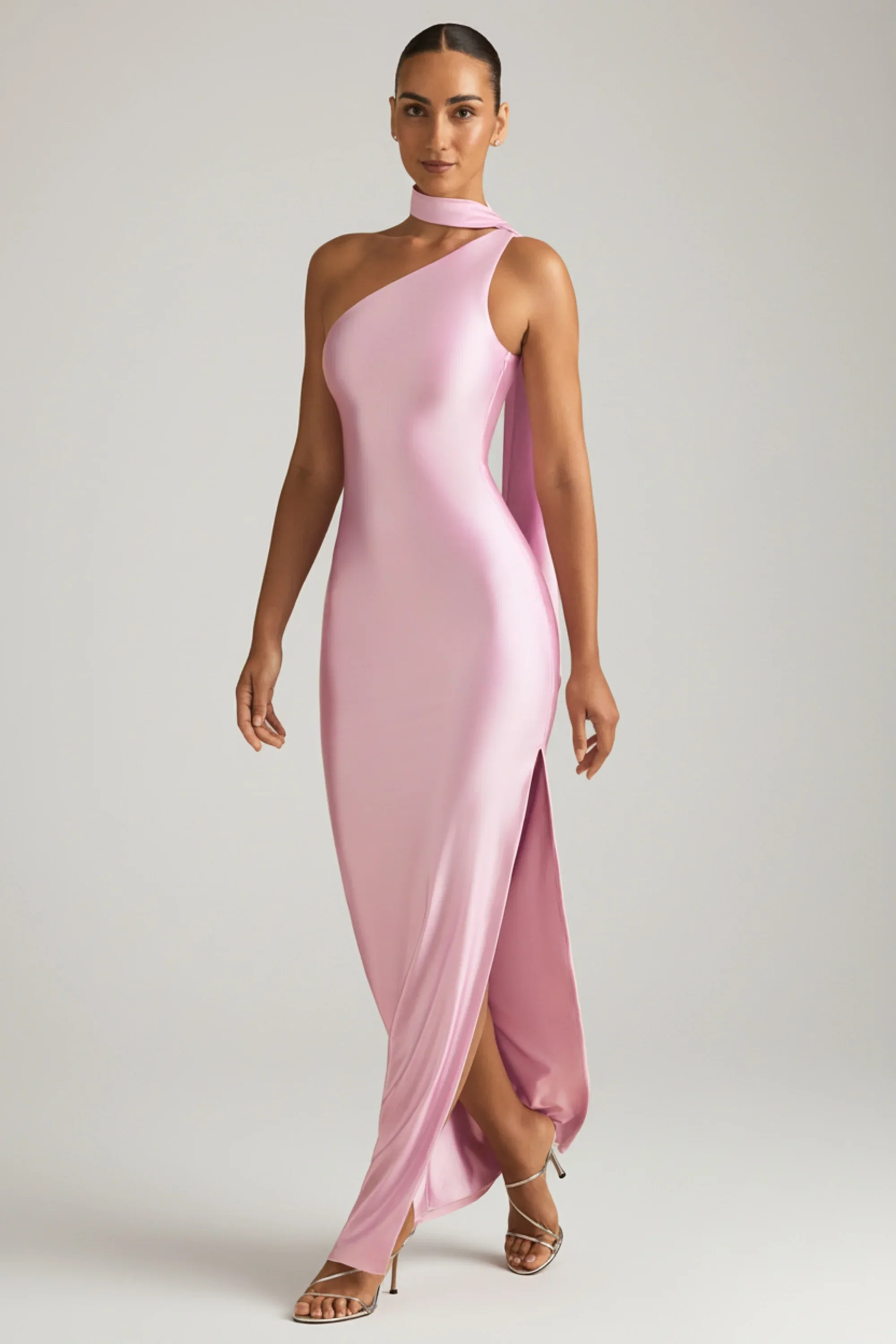 Asymmetric Scarf-Detail Maxi Dress in Soft Pink